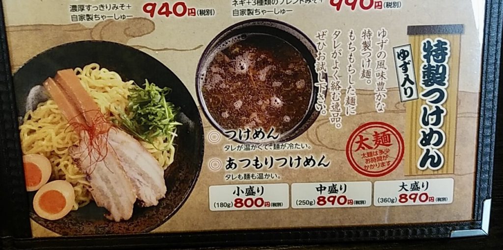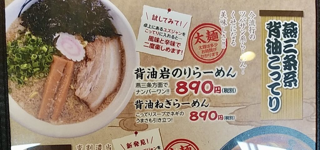 最初から「塩らーめん」にしようと思ってたので、あまり他のメニューには気に留めなかったのですが、「しょうゆ」「みそ」「燕三条(背脂)」「つけめん」と いろいろあるんですね。